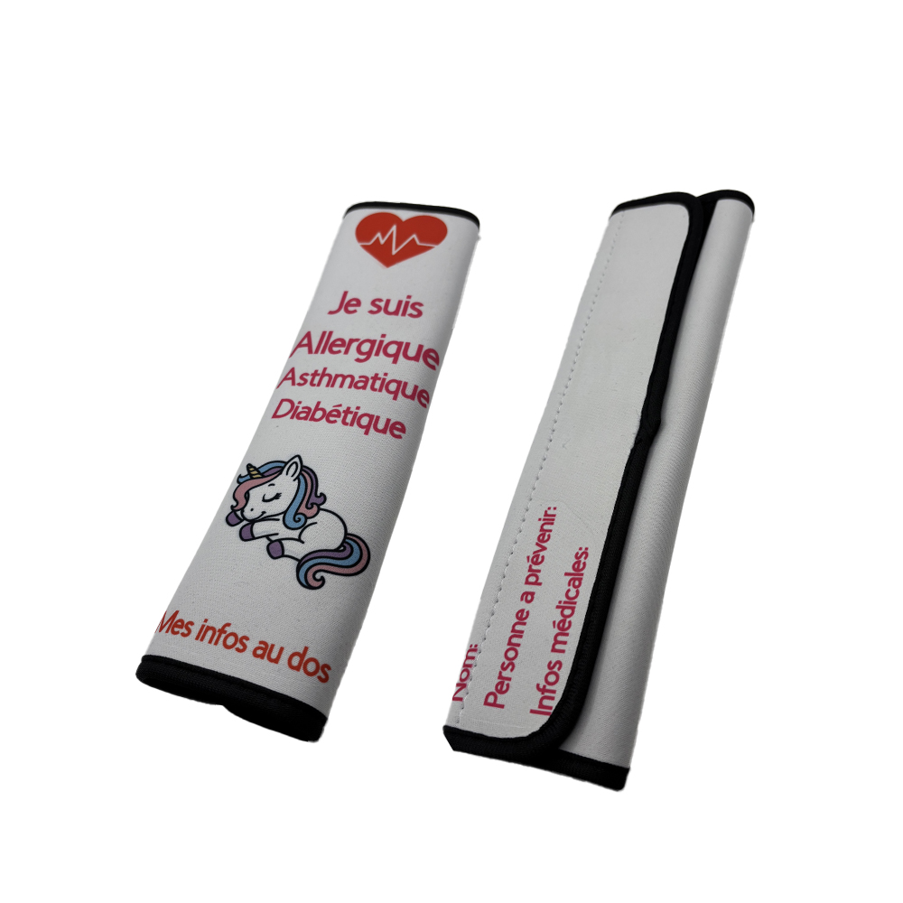 Indique clairement la maladie de l’utilisateur et contient les infos essentielles au dos (contact d’urgence, infos médicales). Confortable, sécurisant et facile à installer.
